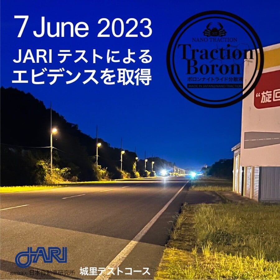 今般、ナノ・トラクションでは、2023/6/7に一般財団法人日本自動車研究所の城里テストコースにおいて、惰性テストを行いました。そこで、有効と思われるエビデンス取得に成功いたしました。また、2023/7/31には一般財団法人日本自動車研究所の城里テストコースにおいて、急制動テストを行いエビデンス取得に成功いたしました。