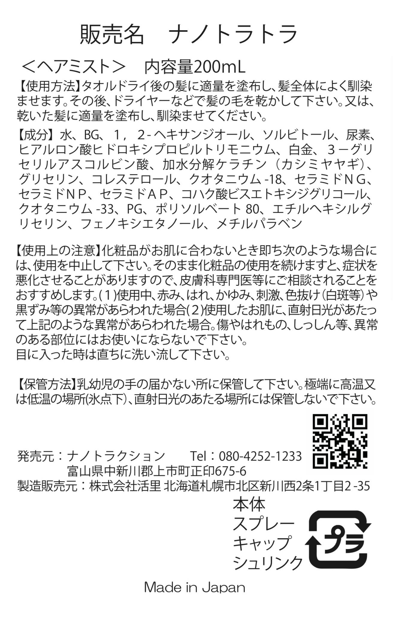 プラチナ入りのヘアミストになります。製造許可を持つ工場で製造しております。
